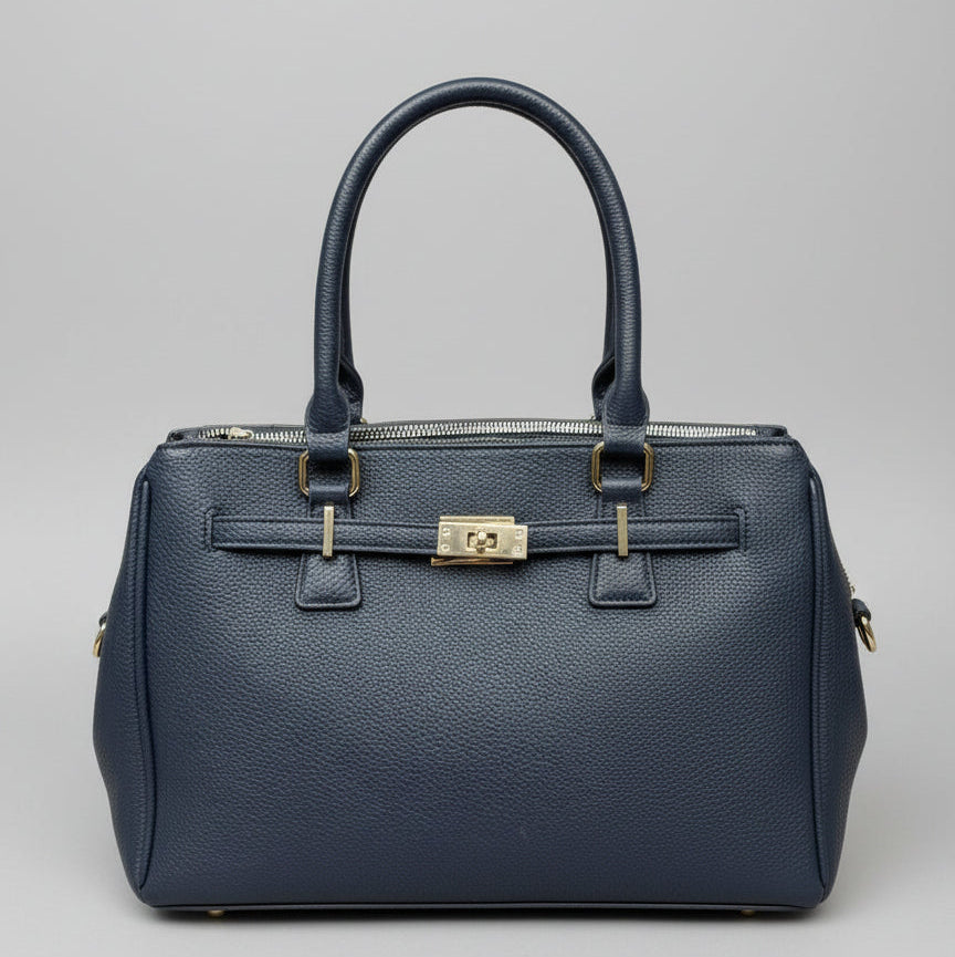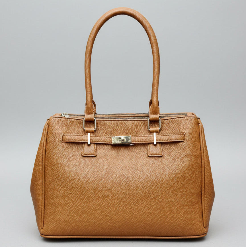 Aggiungi un tocco di eleganza ai tuoi look quotidiani con questa borsa in ecopelle dalla linea strutturata. Dotata di manici rigidi e chiusura con dettaglio metallico, è la compagna ideale per outfit da lavoro, uscite in città o occasioni più formali. Capiente, resistente e curata nei dettagli, è disponibile in due varianti di colore: blu notte e cammello.