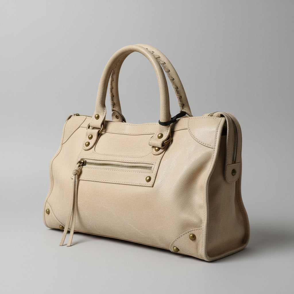 Borsa in Pelle Beige con Manici Intrecciati e Dettagli Metallici