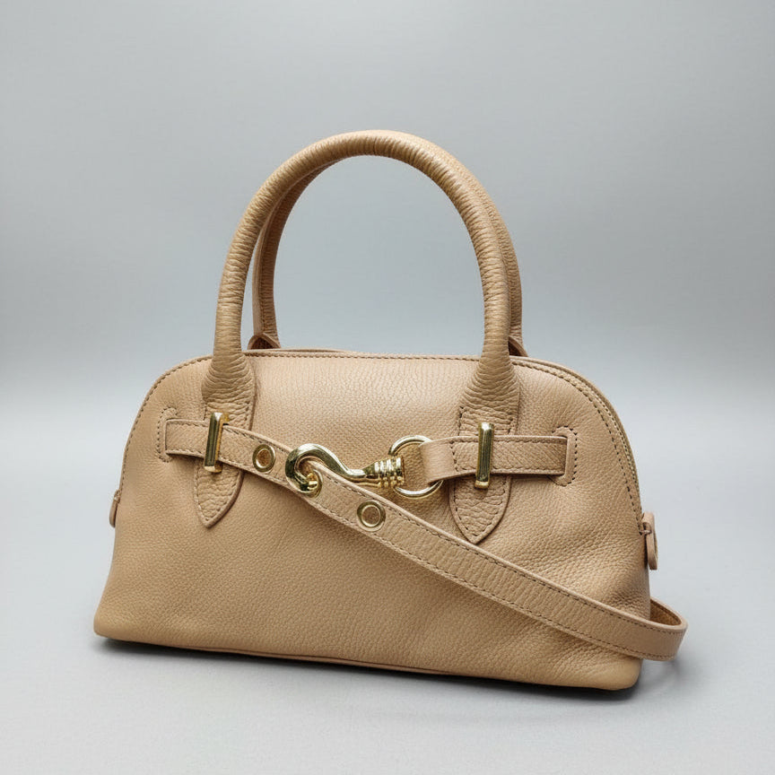 Realizzata in vera pelle martellata, questa borsa combina stile e funzionalità grazie al suo design curato nei dettagli. Il frontale è impreziosito da un dettaglio metallico dorato, che aggiunge un tocco distintivo e raffinato. I doppi manici rigidi garantiscono una presa comoda e un look strutturato, mentre la tracolla regolabile e removibile ti permette di indossarla anche crossbody.