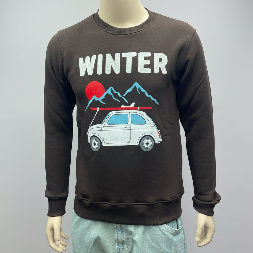 Aggiungi un tocco di stile invernale al tuo outfit con questa felpa uomo marrone con stampa Winter e grafica auto tra montagne. Un capo caldo, comodo e originale, perfetto per look casual e streetwear nelle giornate più fredde.